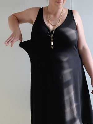 The body shape/length is very similar to our original swing dress. Designed to be fitted on the top and swing away from the waist/hip.