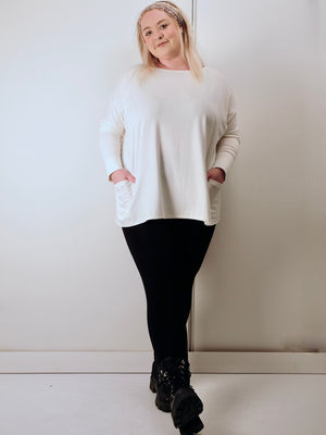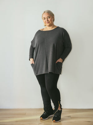 Our larger model is wearing size M/L in the ivory tunic and XL/1X in the charcoal to show how you can size up or down easily.